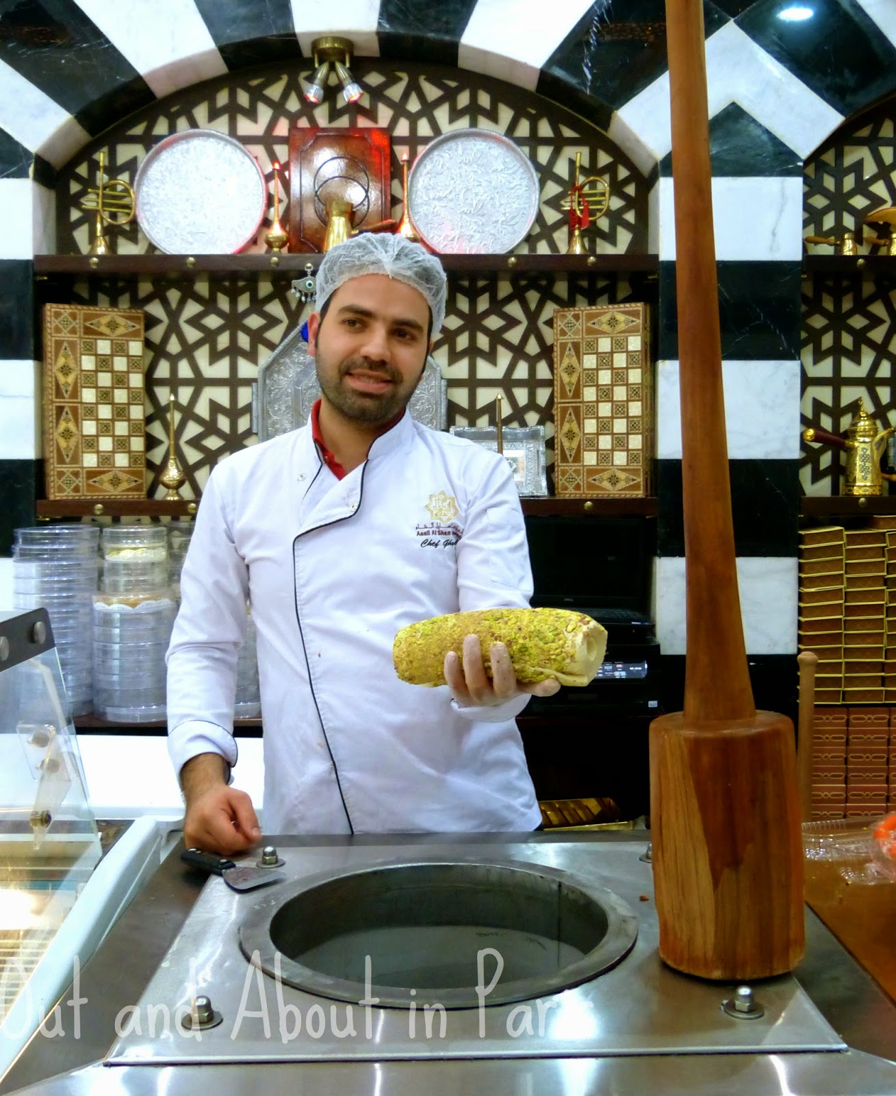 Booza, Arabic ice cream made out of milk, mastic (the resin of an evergreen plant associated with pistachio) and sahlep (orchid tubers). The ice cream is pounded with the wooden mallet seen in the photo on the left to develop its characteristic chewy texture.